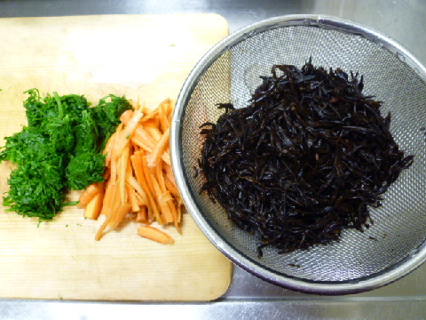 4.豚肉に火が通ったら、戻したひじき、人参をいれ炒める。