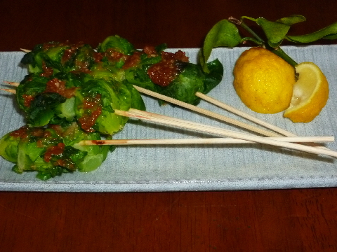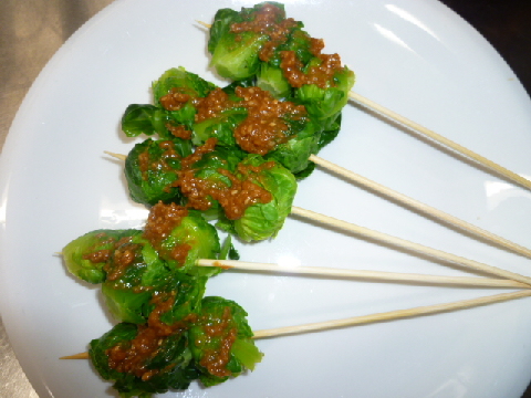 1.芽キャベツを軽くゆでたら、適当な数を串にさしていく。