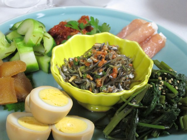 数の子、チャンジャ、煮玉子、そして、空芯菜のナムル風おひたし、キュウリの浅漬け。