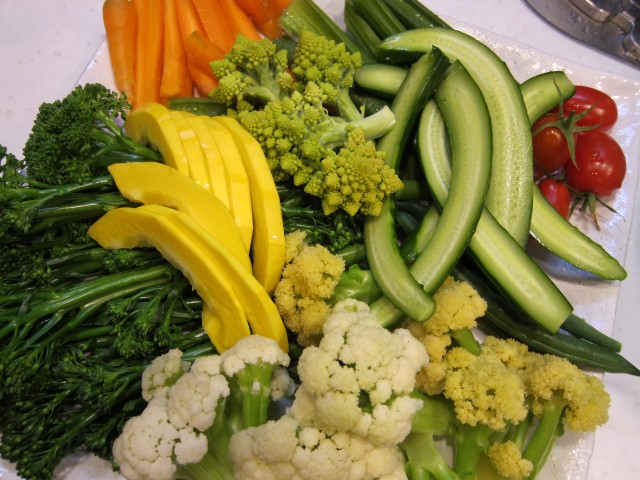 今日のバーニャカウダーサラダは、コリンキー、キュウリ、カリフラワー(花嫁)、オレンジブーケ、ロマネスコ、セロリ、ミニキャロット、スティックセニョール、ミニトマト(アイコ)、すじなしインゲン豆。BY ファームベジコでした!