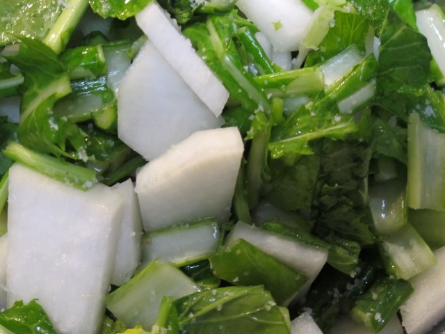 1/4は、小さく切って、葉っぱや茎と一緒に塩もみ。