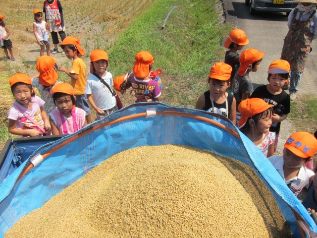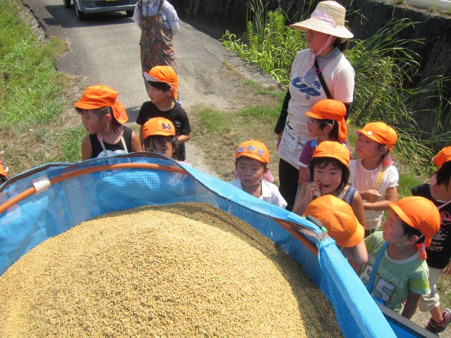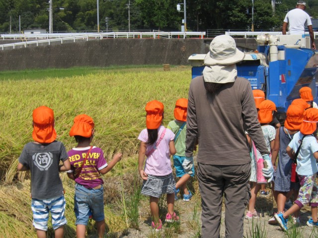 稲刈りの最終日は、園児達のかわいい「頑張れ!」コール。農産物の生産を、身近に感じてもらう事が、私達の願です。