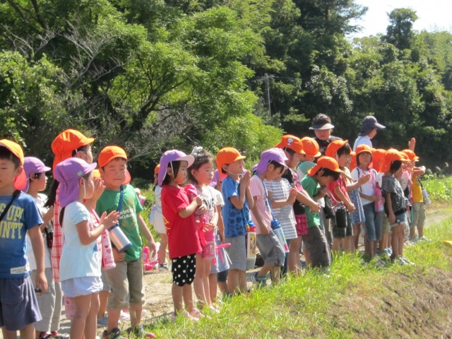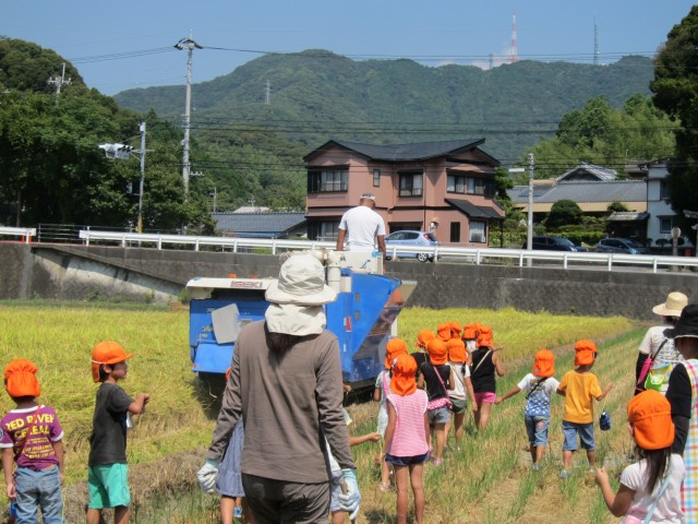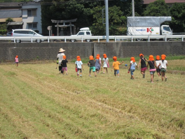 あっと言う間に刈り終えた田んぼの中を、虫やカエルを追いかけながら帰っていく園児達。