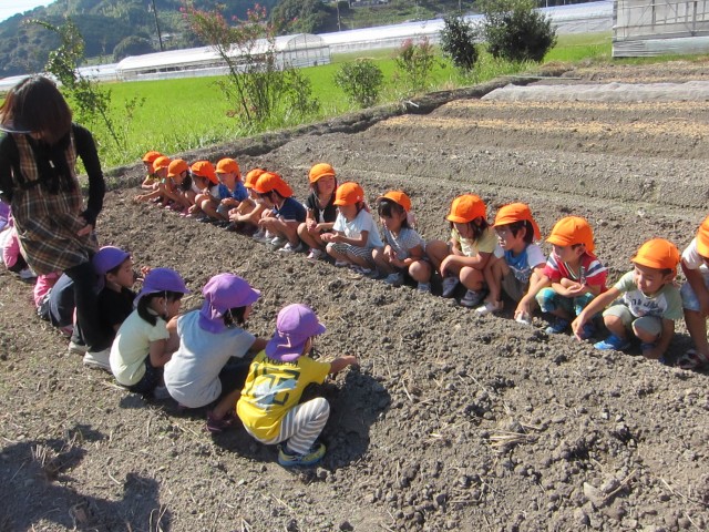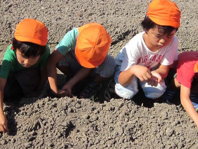 ひまわり組(年長)、すみれ組(年中)の子供達が大根の種蒔きに畑に来てくれました。
