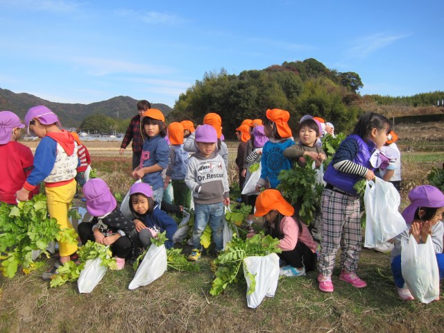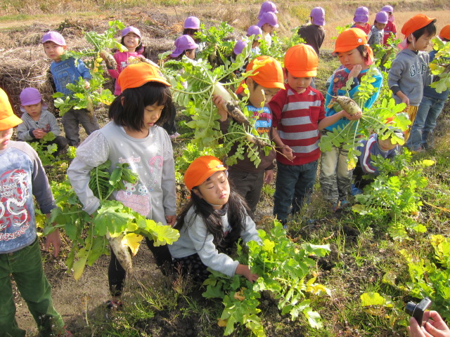 みんなの笑顔が輝いています。うららか保育園の大根収穫祭!