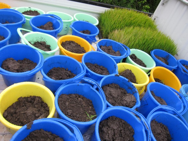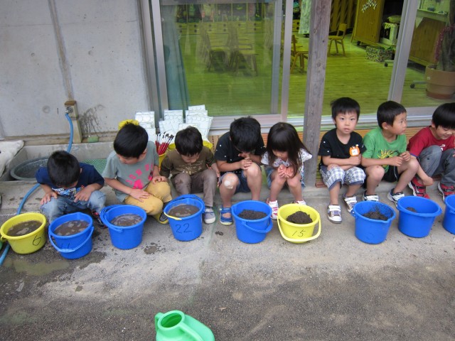 あいにくの雨でしたが、1人々のバケツに田んぼの土を入れ、