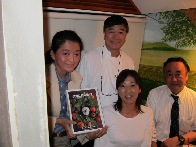 お忙しいのに、わざわざ地下の特別室に、ご挨拶に来てくださった、落合シェフ、永田農法研究所の鈴木さん、司牡丹酒造、竹村社長と、記念撮影!