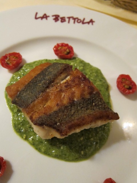 おすすめ魚料理、すずきのグリル、ソースはジェノベーゼ