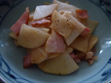 入河内大根とベーコンを炒める。