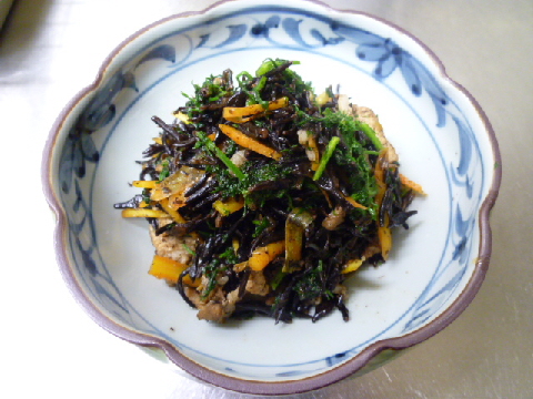 4.豚肉に火が通ったら、戻したひじき、人参をいれ炒める。