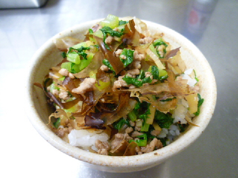 2.鍋に油を熱し、しょうが、豚ひき肉、大根葉をいれ炒める。