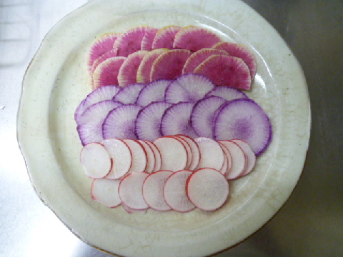1.3種類の大根は、それぞれ薄切りにしたら、