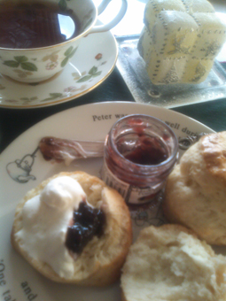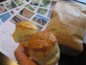 約25年前のシドニー郊外。100年以上の歴史あるカフェのメニューにあった「デボンシャーティー」の名前。好奇心で注文して出会ったのがスコーンだった。ふんわりモコモコのそれにクロテットクリームと甘いイチゴジャムをのせてパクリ。ン!オイシーーーッ!以来アノ味を求めて日本でスコーンジプシーになった。有名店のものでもボソボソして美味しくない。リッツカールトンのハイティーでもダメだった。唯一近かったのはイギリスの紅茶メーカー・リッジウェイの「スコーンミックス」を買って手作りしたもの。そして2009年12月3日、ついに、アノ味に再会!まず香り、そして中身の湿度とやわらかさ!噛むほどにしっかりと味わい深い。堅めにホイップしたクリームとミックスベリーのジャムを付けていただいた。しみじみ・・・幸せ。モーネさんありがとうございました♪まーちゃん、マンボ、いつも感動のおすそわけをありがとう♪12月3日はスコーン記念日です。