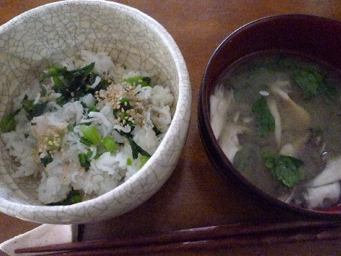 2,炊いたごはんに、春菊、ちりめんじゃこを入れ、