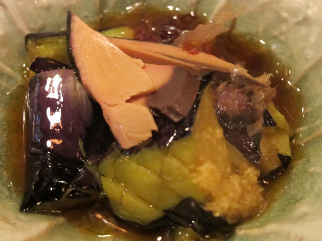 ナスの土佐煮、削りたて鰹節かけ