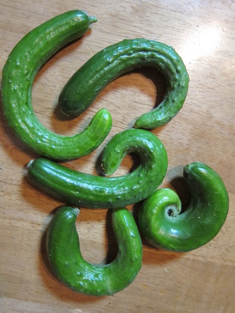 最終収穫は、小さい実や、曲がったキュウリも、