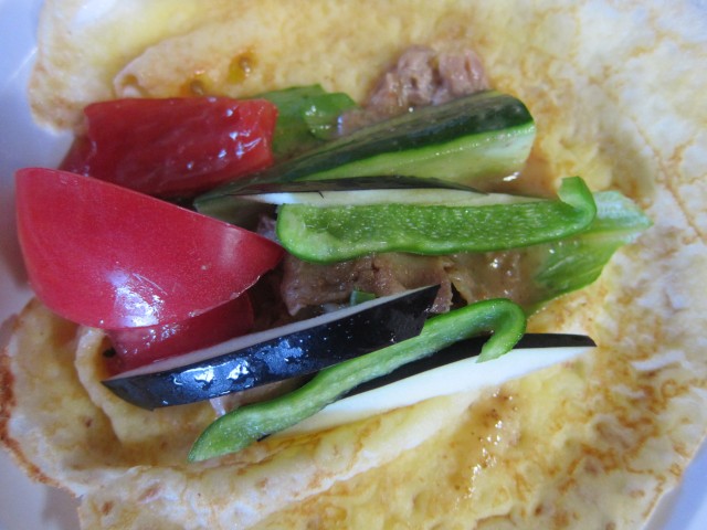 もっちもっちの、米粉クレープに、夏野菜とツナや、お肉を