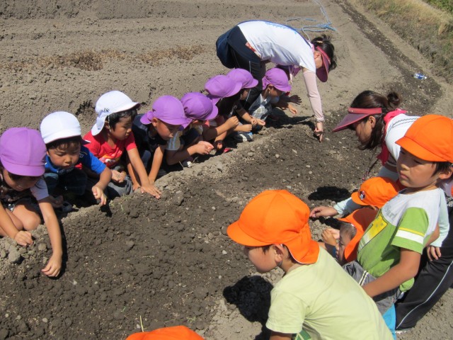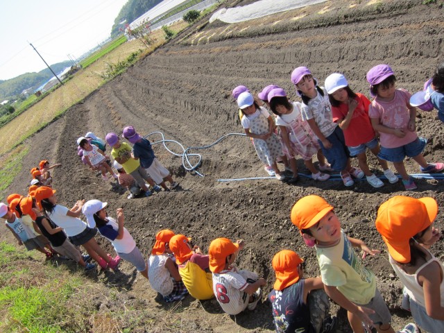 しるしをつけた、穴に、種をまいて、