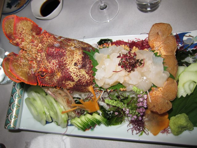 いよいよ、今回のメイン、伊勢海老。厚切りのカツオと、ヒラメと一緒に、 船中八策ひやおろしで、味わいます。