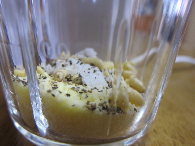 にんにく、松の実、粉チーズ、塩、ブラックペッパーを