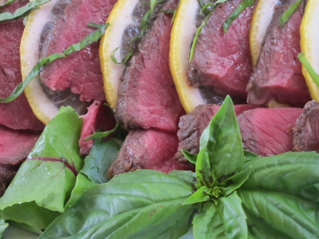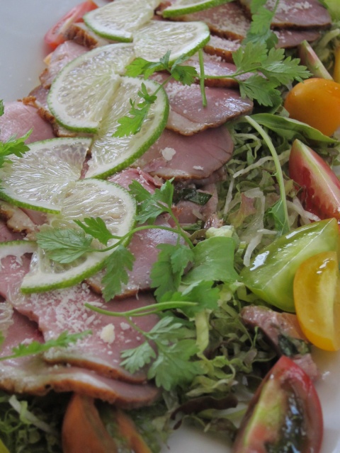 鴨胸肉の生ハムには、ライムとハーブサラダ、