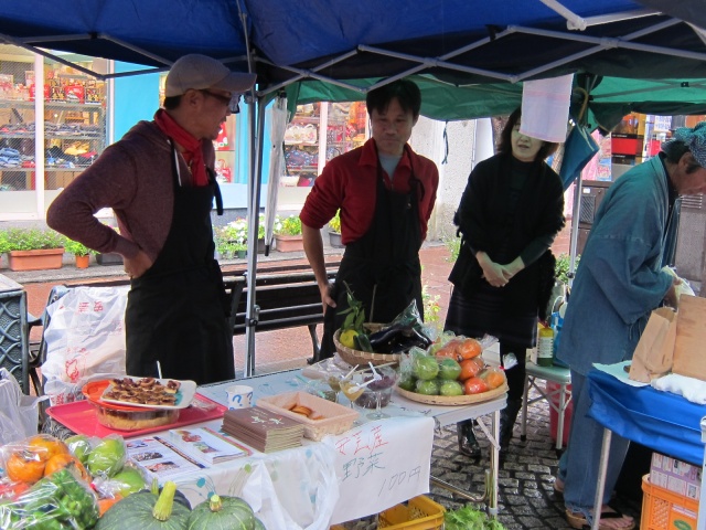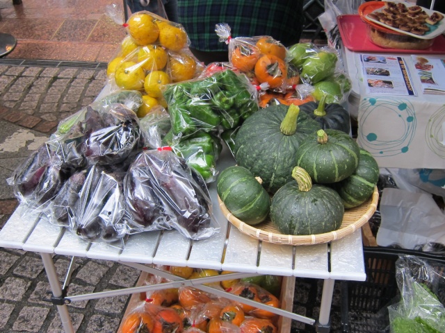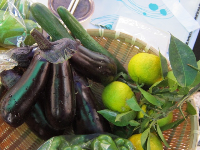 採れたての、ナス、水菜、芋のツル、カボチャ、ピーマン、柿、柚子、さつま芋などなど、さすがの品揃えです。