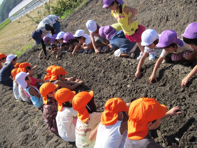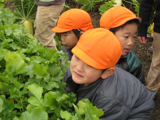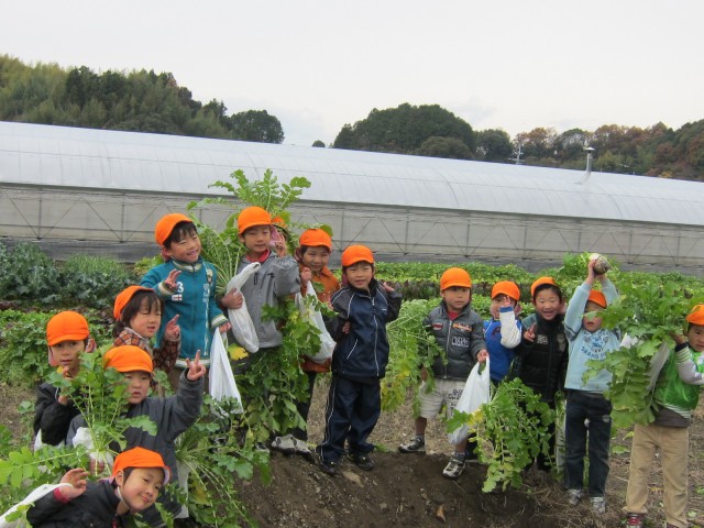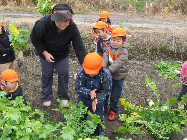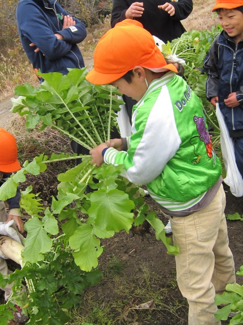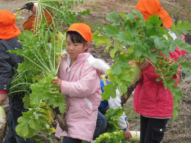 女の子も、収穫した大根を、大事そうに自分の袋に入れています。