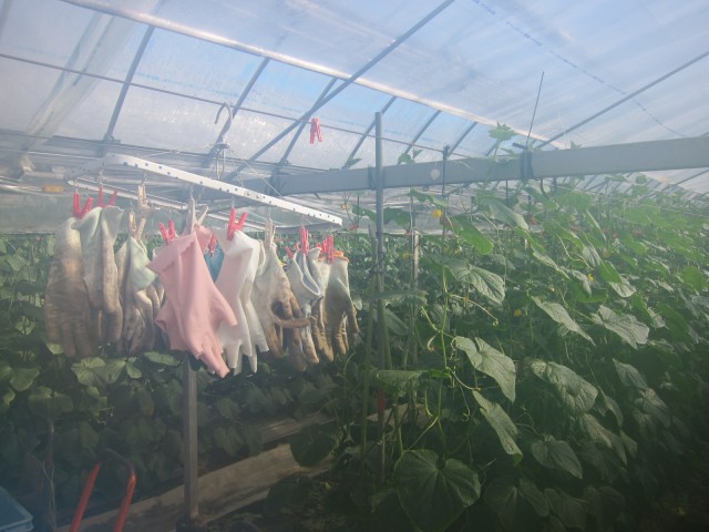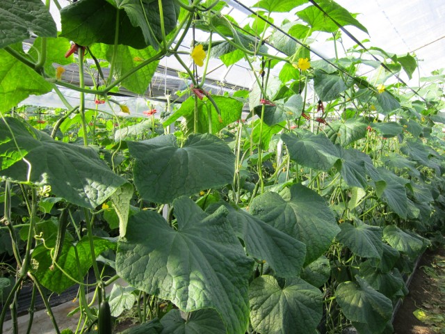 キュウリのハウスの中は、25〜30℃、ハワイのように快適です。(かなり無理にそう思っていますが)