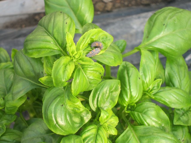 よ〜く見ると、なんか大きな虫が、アブラ虫を食べている・・・。天敵として、入れてある、てんとう虫ではないようだし・・・、なんかいっぱい増えている・・・。