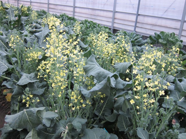 高知の春は短く、暖かくなったと思うと、すぐ夏になります。ハウスの中では、ブロッコリーやスティックセニョールの花が満開