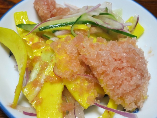 上には、トマトをシャーベット状にしたものをかけ、ひんやり爽やかな、夏のサラダにしてくれました。