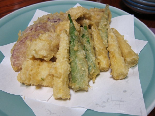 添えられた、オクラ、ヤングコーンの天ぷら、