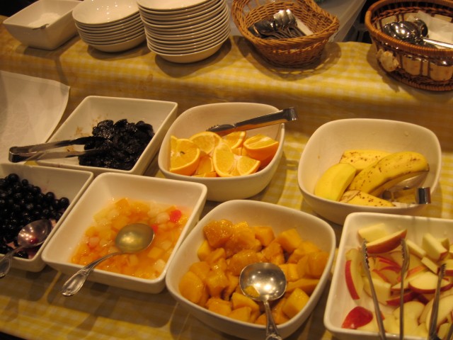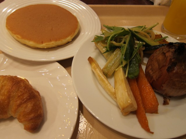 クロワッサン1個と、オーダーして焼いてもらった、ホットケーキ1枚、後は、野菜を山ほどいただきました。