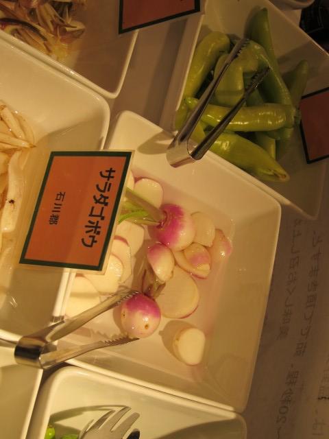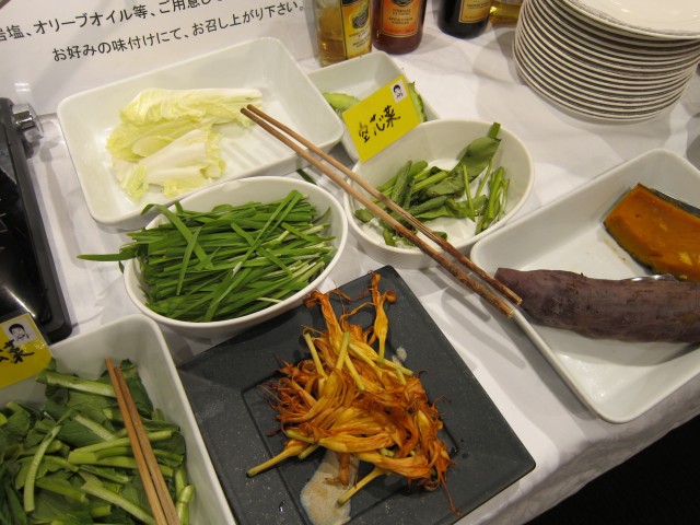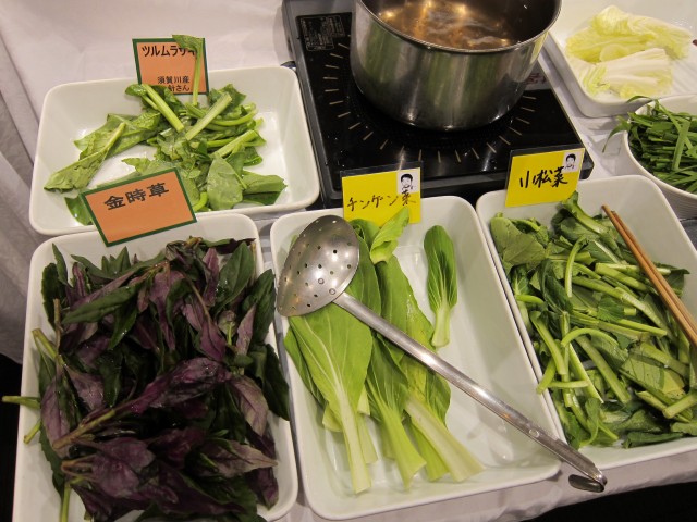 中でも、野菜のしゃぶしゃぶコーナーは、お好みのビネガーとオリーブオイル、塩で、野菜本来の味をシンプルに、味わえ、ナイス! 金時草や、四角豆、沖縄野菜の花まであり、