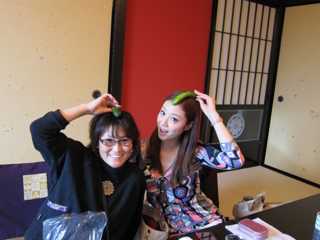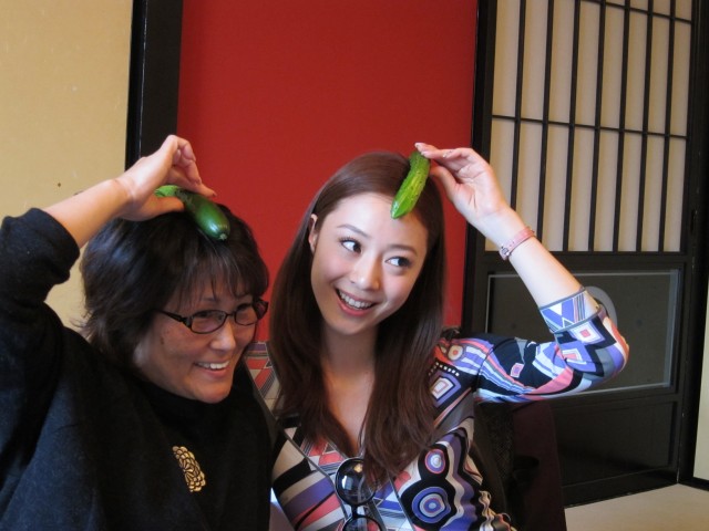 打ち合わせが終わり、美佐子女将と一緒に「キュウリでちょんまげ〜」。