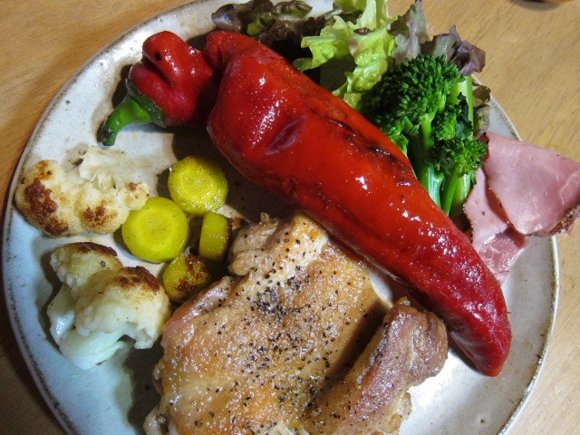 カリフラワーや、黄人参、スティックセニョールなども添え、チキンのグリルがメインディッシュではなく、「パレルモ」がメインの一皿が出来上がりました。