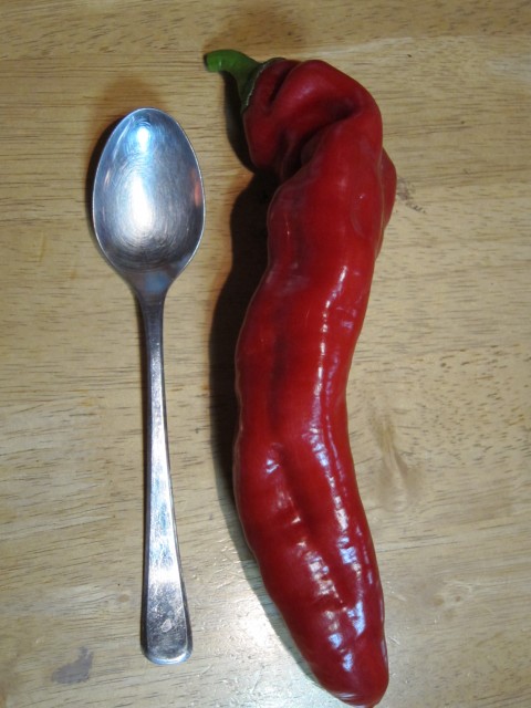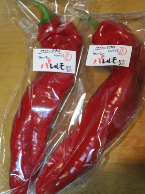 切ってしまうと、普通のパプリカや赤ピーマンと同じになってしまうので、できれば、この形を生かしたお料理にしたいなあと、縦に半分切って焼いてみました。
