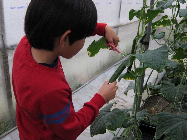 みんな、ハウスの中を、大きいキュウリを探しまくります。