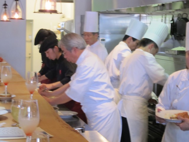 会場の土佐バルの志摩シェフ他、オールスタッフ、グランディールの島田シェフ、日航旭ロイヤルホテルのシェフも厨房に集結!