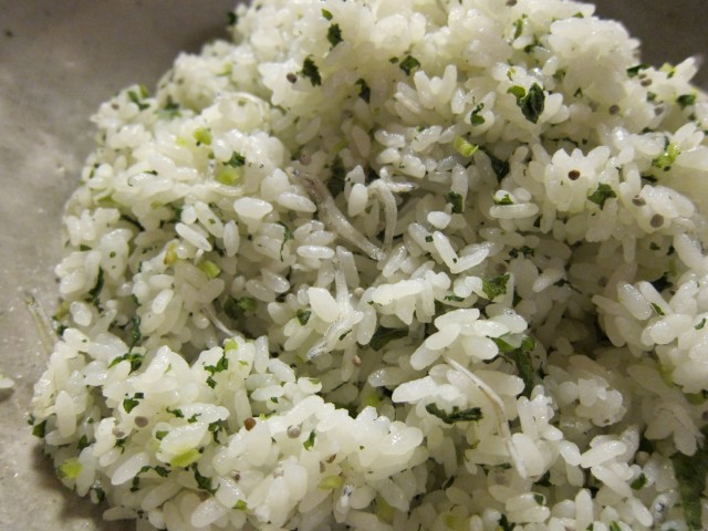 プチプチえごまの食感がたまらない、おじゃこ菜飯。