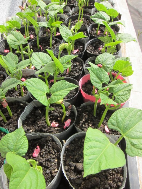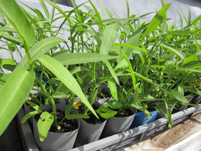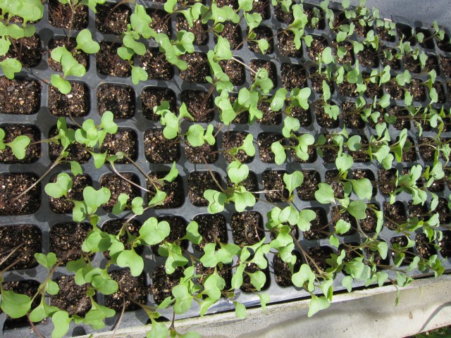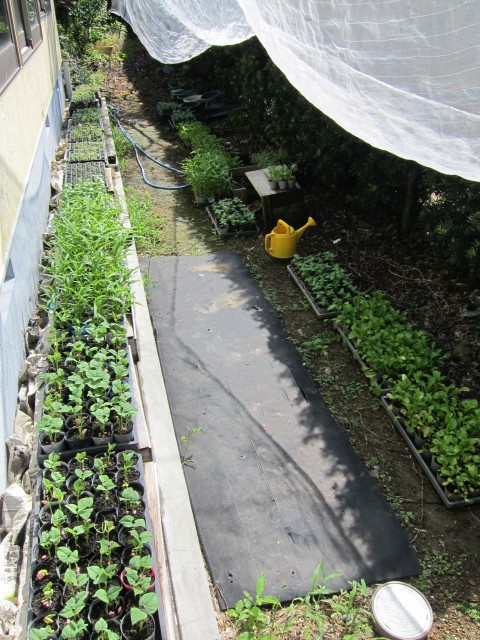 軒下で、ジーット出番を待ってる、野菜苗