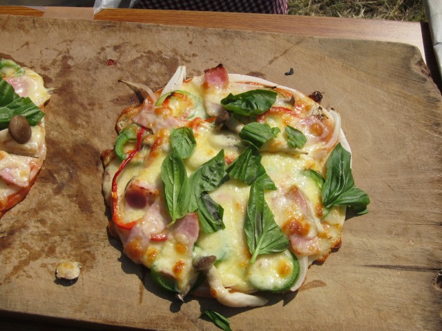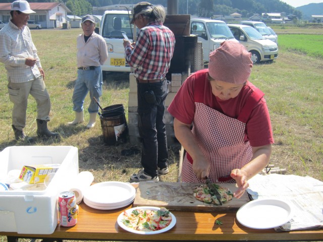 今回の、酒米稲刈後の、懇親会も、150個以上のコンテナを、いろんなところから集めて椅子にし、BBQ,おにぎり、サラダ、デザートなど、最高のおもてなしをしてくださいました。手作りの移動式石窯で、焼くピザは、鳩オヤジの仁井田米の米粉使用、ファームべジコのバジルを添え、大好評でした。