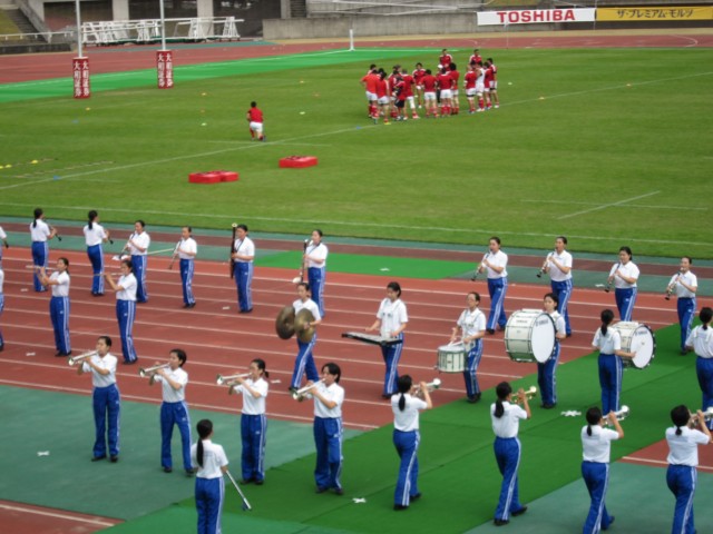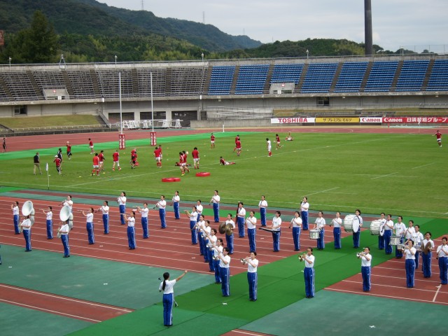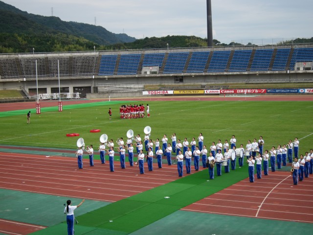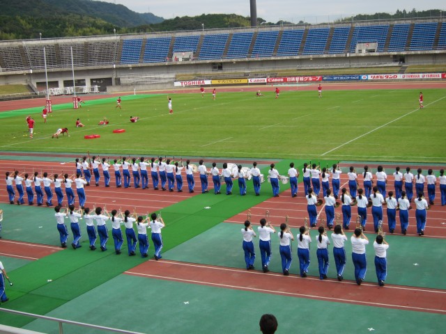 日本トップリーグの試合はさることながら、私達が楽しみにしていたのは、この大舞台の開幕セレモニーに、我が母校、土佐女子高校の吹奏楽部のマーチングが参加すること!
