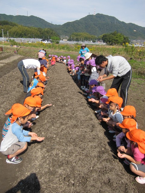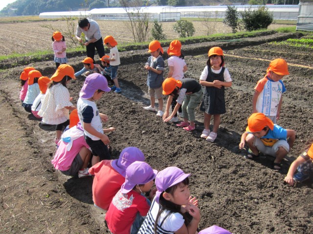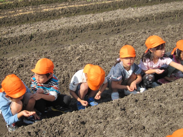 年長&年中さんが、小さい手で小さい種を、大事に大事に蒔いて、やさしく土をかけ、芽が出ますようにと、お祈りします。
