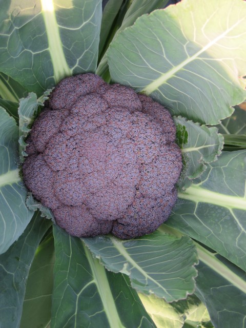 和名、花キャベツ。ブロッコリーや、スティックセニョールは、真ん中を収穫しても、春先まで、脇芽が出て来て、収穫できますが、カリフラワーは、大きな株に1つだけ。大きな葉に守られた、お嬢様のような野菜です。