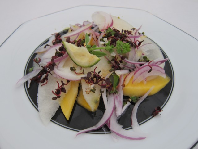 イッチーと加枝ちゃんの、ウェディングパーティーは、なんと、フードコーディネーターで、映画「eatrip」の監督、野村友里さんが、最初の2皿を作ってくださるというで、とっても楽しみにしていました。1週間前に、表参道のレストランeatripに、いろんな野菜やハーブをお送りし、試作していただきできたのが、「梨(豊水)、コリンキー、足摺レッドのサラダ」ドレッシングにはブシュカン使用、バジルの花も添えられています。