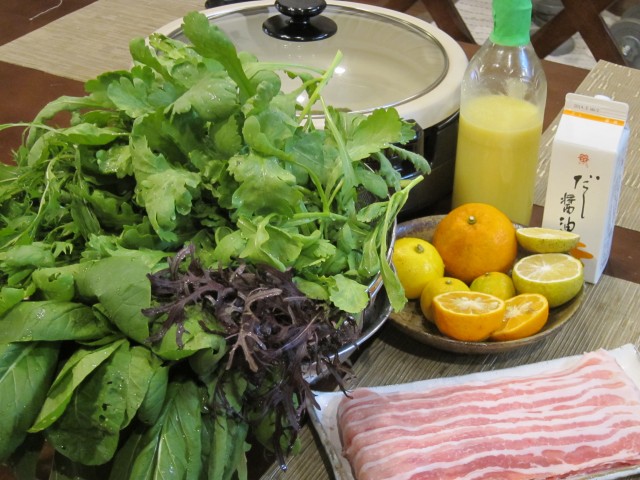 早速、畑の葉物野菜を山ほど収獲し、今晩は完熟酢みかんのポン酢で、青菜シャブシャブ。